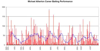 His playing career included controversy, including ball tampering, and several brushes with the media with whom, by Atherton's own admission, he did not have a good understanding when he was a player.[3] Often hampered by a chronic back complaint which was to contribute to the end of his career, Atherton was considered a leading England batsman during the 1990s. Following retirement he became a journalist and is a cricket commentator with Sky Sports, and chief cricket correspondent of The Times.