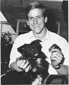 ![]() Michael Dow and his dog, Hitam, displaying his five Olympic medals from the 1964 Tokyo Paralympic Games | |||||||||||||||||||||||||||||