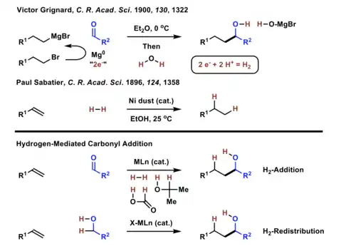 - Kim, Seung Wook; Zhang, Wandi; Krische, Michael J. (2017). "Catalytic Enantioselective Carbonyl Allylation and Propargylation via Alcohol-Mediated Hydrogen Transfer: Merging the Chemistry of Grignard and Sabatier". Accounts of Chemical Research. 50 (9): 2371–2380. doi:10.1021/acs.accounts.7b00308. PMC 5641472. PMID 28792731.