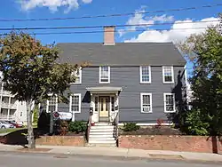 The Michael Reade House stands on the southern fringe of Dover's central business district, on the east side of Main Street opposite the Cocheco Mills complex. It is a 2+1⁄2-story wood-frame structure, with a side-gable roof, central chimney, and clapboarded exterior. Its main facade is five bays wide, with the outer bays symmetrically placed and the center bay, where the entrance is located, skewed slightly to the left. The entry is flanked by sidelight windows and is sheltered by a mid-to-late 19th century Victorian bracketed hood. The interior follows a central chimney plan, but has an unusually wide chimney bay, suggestive of the idea that the chimney may have been built after the frame instead of before. There is fine Georgian-style wood paneling in the kitchen and southwest parlor, and transitional Federal woodwork in other rooms.[2]