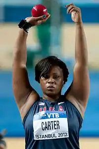 In addition to winning the 2008 United States Olympic Team Trials, she was the 2009, 2011, 2013, 2014, 2015 and 2016 national champion.[6] While competing for the University of Texas, she won the NCAA collegiate national championship in 2006. In college, she was a seven time All-American, and also won the Big 12 Conference title five times. In 2006, she won the NCAA indoor title to also help the University of Texas women claim the NCAA team title. With a runner-up finish in the shot put at the 2005 outdoor meet, Carter helped the Longhorns win the NCAA championship.
