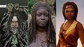 ![]() From left to right: Michonne, as she appears in the comic book series, television series (portrayed by Danai Gurira) and video game series. | |
