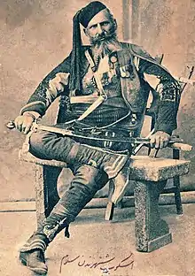 He had succeeded in leading the četa (rebel band) of Rista Kostadinović when Rista had died in battle.[8] He was given Rista's gun which was ornamented with silver and nacre.[8] He was suited with the red vojvoda mintan (under jacket) by tailors in Kičevo in secrecy during the night.[8] Serbia secretly and carefully aided the Christians in the Ottoman areas; in the Brsjak revolt, however, by the end of 1881, the aid was stopped by the intervention of the Ottoman government.[10] The Ottoman army succeeded in suppressing the rebellion in the winter of 1880/1881, and many of the leaders were exiled.[11] When the revolt had been suppressed in Demir-Hisar, Micko refused to give himself up.[8] The Brsjak Revolt, and the preceding ones in Kumanovo, Kriva Palanka and Kratovo, had all a Serbian character, planned in the Serbian cause, thus, the unsuccessful outcome resulted in persecution of Serbs in the Macedonia region, with an increased Bulgarization of the region's Christian Slavic populace.[12]