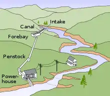 Microhydro systems are typically set up in areas capable of producing up to 100 kilowatts of electricity.[4] This can be enough to power a home or small business facility. This production range is calculated in terms of "head" and "flow". The higher each of these are, the more power available. Hydraulic head is the pressure measurement of water falling in a pipe expressed as a function of the vertical distance the water falls.[4] This change in elevation is usually measured in feet or meters. A drop of at least 2 feet is required or the system may not be feasible.[5] When quantifying head, both gross and net head must be considered.[5] Gross head approximates power accessibility through the vertical distance measurement alone whereas net head subtracts pressure lost due to friction in piping from the gross head.[5] "Flow" is the actual quantity of water falling from a site and is usually measured in gallons per minute, cubic feet per second, or liters per second.[6] Low flow/high head installations in steep terrain have significant pipe costs. A long penstock starts with low pressure pipe at the top and progressively higher pressure pipe closer to the turbine in order to reduce pipe costs.