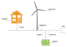 Community microgrids can serve thousands of customers and support the penetration of local energy (electricity, heating, and cooling).[11] In a community microgrid, some houses may have some renewable sources that can supply their demand as well as that of their neighbors within the same community. The community microgrid may also have a centralized or several distributed energy storages. Such microgrids can be in the form of an ac and dc microgrid coupled together through a bi-directional power electronic converter.[12]