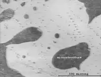 Microstructure is the very small scale structure of a material, defined as the structure of a prepared surface of material as revealed by an optical microscope above 25× magnification.[1] The microstructure of a material (such as metals, polymers, ceramics or composites) can strongly influence physical properties such as strength, toughness, ductility, hardness, corrosion resistance, high/low temperature behaviour or wear resistance. These properties in turn govern the application of these materials in industrial practice.