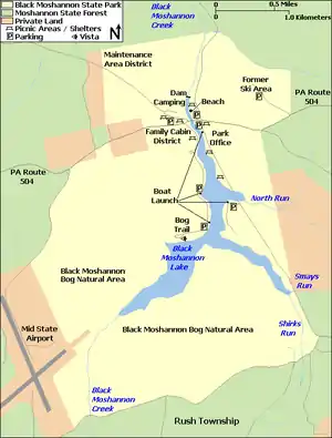"Black Moshannon Airport" was built on land taken from Black Moshannon State Park and Moshannon State Forest just before the Second World War,[5] and was operational by 1942, hosting a Civil Air Patrol training exercise for nearly 300 planes on May 30, 1942.[6] It was renamed "Mid-State Airport" in 1962.[7]
