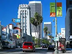 Park Mile is a commercial strip that lies along Wilshire Boulevard between Highland Avenue on the west, Wilton Place on the east, Sixth Street on the north and Eighth Street on the south. Some of the office buildings in the district have been designed to harmonize with the nearby Hancock Park area, with long, horizontal warm look of brick and other textures rather than a vertical high-tech design. Construction is regulated by the Park Mile Ordinance, adopted by the city in 1979.[21][22] It was designed to protect the single-family nature of the residential area and to promote development that provided Park Mile with an "image and sense of continuity."[23] There is a three-story height limit along Park Mile,[24] as well as a ban on painted signs on the outside of buildings.[25] In 1990 a Park Mile-Wilshire District neighborhood design review board, composed of five to seven volunteers appointed by City Council members, was one of four such local boards throughout the city that oversaw architectural planning.[26]