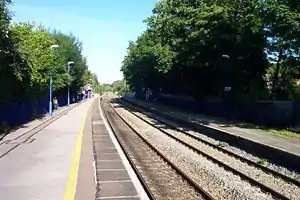 The station was subsequently renamed twice by British Rail: on 2 November 1964 it became "Midgham Halt" but on 5 May 1969 it reverted to "Midgham".[7] The station is a mile distant from Douai Abbey and the station name was subtitled "for Douai Abbey and School" until refurbishment with current Network Rail signage.