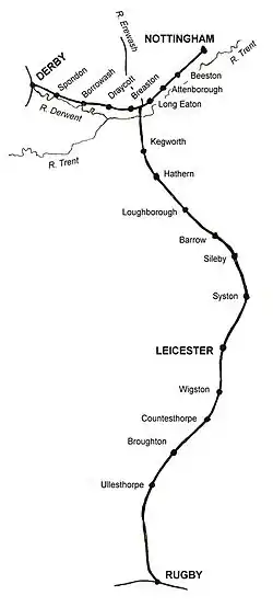 ![]() Map of the route of the Midland Counties' Railway | |