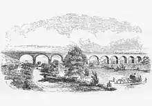 The viaduct is approximately 700 feet (210 metres) long, and consists of eleven elliptical arches, elevating 40 feet (12 m) above the valley floor. It is built of red brick, with a facing of Staffordshire blue bricks and sandstone.[1][2][3]