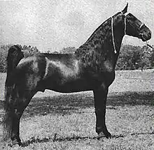 Midnight Sun has been described as the single most influential Tennessee Walking Horse sire and a sire of sires. Since 1949, only four horses not of Midnight Sun's line have won the Tennessee Walking Horse World Grand Championship, the breed's highest honor.[1] Midnight Sun sired five horses who won the World Grand Championship:[7] Midnight Merry in 1949;[8] The Talk of the Town in 1951, 1952, and 1953;[9] Sun's Jet Parade in 1957;[9] Setting Sun in 1958; and Sun's Delight D. in 1963.[10] One of these, The Talk of the Town, was the first three-time World Grand Champion. Midnight Sun was also great-grandsire of I Am Jose, the second three-time winner.[11] Most of the leading Tennessee Walker sires in recent years have themselves been descendants of Midnight Sun, most notably his son Pride of Midnight, who took his father's place as Harlinsdale's lead sire after the older horse's death.[12] Midnight Sun sired approximately 2,600 foals in his lifetime,[13] and during his stud career earned his owners close to $100,000 a year, mostly through the then-new use of artificial insemination (AI).[3] Through his offspring, he has also influenced the Racking Horse and Spotted Saddle Horse breeds. For many years, a life-size statue of Midnight Sun, commissioned after his death by his former owner Geraldine Livingston, stood at the TWHBEA headquarters in Lewisburg, Tennessee.[14]