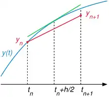 The name of the method comes from the fact that in the formula above, the function giving the slope of the solution is evaluated at the midpoint between at which the value of is known and at which the value of needs to be found.