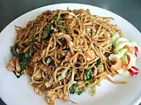 In Indonesia, where mie goreng is one of the most widespread simple dishes, the dish's origin is clearly associated with Chinese Indonesian cuisine.[1] Chinese influences are evident in Indonesian food, such as bakmi, mie ayam, pangsit, bakso, lumpia, kwetiau goreng, and mie goreng.[4] The dish is derived from Chinese chow mein and believed to have been introduced by Chinese immigrants in Indonesia. Despite being influenced by Chinese cuisine, mie goreng in Indonesia have a definite Indonesian taste, it has been more heavily integrated into Indonesian cuisine;[5] for example the application of popular sweet soy sauce that add mild sweetness,[6] sprinkle of fried shallots, addition of spicy sambal and the absence of pork and lard in favour of shrimp, chicken, or beef; to cater for the Muslim majority.