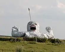 North Dakota has a number of these giant statues including a 40-foot (12 m) sandhill crane, a 38-foot (12 m) high Holstein cow, a 40-foot (12 m) grasshopper, and a 60-short-ton (54 t) buffalo. One hypothesis put forth is that these figures distinguish one community from another in an otherwise somewhat featureless landscape.[4]