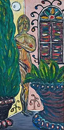 Fleitas often depicts Cuban-associated scenes such as tropical landscapes, roosters, female nude studies, and still lifes with vivid and saturated color to enhance vibrancy. His female torso series are often abstracted, such as without heads. Fleitas utilizes expressionistic methods to depict the female form in a purposefully sexualized way, utilizing bold exaggeration to challenge modern societal beauty conventions and standards that women are held to, particularly in Latin America.[26] Fleitas also explored Latin American women as a subject in his Private Landscapes series. [1]