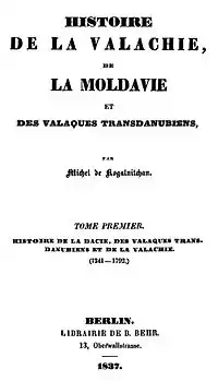 Greatly expanding his familiarity with historical and social subjects, Kogălniceanu also began work on his first volumes: a pioneering study on the Romani people and the French-language Histoire de la Valachie, de la Moldavie et des Valaques transdanubiens ("A History of Wallachia, Moldavia, and of Transdanubian Vlachs", the first volume in a synthesis of Romanian history), both of which were first published in 1837 inside the German Confederation.[6][8][12] He was becoming repulsed by the existence of Roma slavery in his country, and in his study, cited the example of active abolitionists in Western countries.[13]