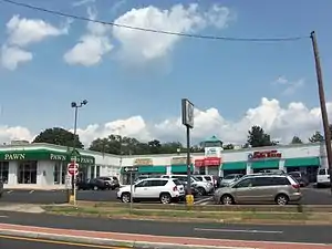 With the end of World War II, Mesrobian designed numerous apartments in Northern Virginia to accommodate the population boom.[24] In 1940, Mesrobian designed the Glebe Center, also known as Glebe Shopping Center located in the Ballston neighborhood of Arlington County, Virginia. It is a one-story, "L"-shaped cinder-block building with a flat parapet roof and clad in a six-course, American-bond brick veneer with cast-stone decorative accents. It features large store-front windows, Art Deco decorative elements, and a central square tower surmounted by a glass-block clerestory capped by a pyramidal-shaped metal roof. It was built to serve the residents of the Buckingham apartment complex and Ashton Heights, as well as the many motorists traveling along Arlington Boulevard and North Glebe Road.[25] It was listed on the National Register of Historic Places in 2004.[26]