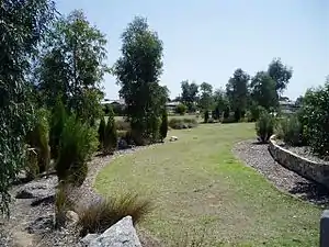 The Mikawomma Reserve is found in the suburb of Woodville Gardens on the corner of Liberty Grove & Ridley Grove in South Australia, Australia. Mikawomma is the Kaurna name for the plain that lies between Adelaide and Port Adelaide (Teichelmann & Schürmann, 1840: 16 Grammar section).[1] The Kaurna people are the traditional custodians of the Adelaide Plains area. The landscape design and the artworks in Mikawomma Reserve reflect indigenous plants and animals as well as culture and history.[2]