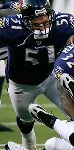 Smith was originally signed by the Baltimore Ravens in the seventh round (234th overall) in the 2005 NFL Draft. In his rookie year he played in six games recording three tackles. He made his NFL debut on October 31 at the Pittsburgh Steelers. In 2006, he played in eight games again recording three tackles.[2] Smith made his first career start against the Tennessee Titans on November 12, 2006 in place of the injured Ray Lewis.[3] On the first play of the game, the Ravens blitzed. Smith was cut by Titans' center Kevin Mawae and fell onto his left shoulder. He suffered a torn labrum, rotator cuff, biceps tendon and dislocated the shoulder. Over the course of the following year and a half, Smith underwent surgery four times to correct his injuries.[3] He received an injury settlement from the Ravens on July 18, 2008 and was released.[4]