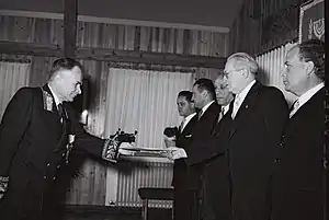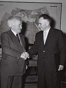 ![]() Newly appointed Russian Ambassador to Israel Mikhail Bodrov (right) is greeted by Israeli Prime minister David Ben-Gurion, Jerusalem. | |