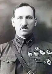 Lieutenant General Mikhail Grigoryevich Yefremov (Russian: Михаи́л Григо́рьевич Ефре́мов; March 11 1897, Tarusa, Kaluga Governorate – April 19 1942, Vyazemsky District) was a Soviet military commander. He took part in the October Revolution, joined the Russian Communist Party (b) in 1919, and became a division commander in 1921. He also became a military advisor to the National Government of China in 1928. During World War II, he commanded the Central Front in August 1941, and the Soviet 33rd Army from October 1941.