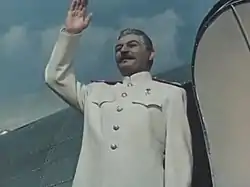 Due to his identification with Stalin, Gelovani was barred from playing other roles in cinema; he was not allowed to depict "mere mortals".[12] From 1942 to 1948, he was a member of the cast in the Gorky Moscow Art Theatre.[4] During World War II, the personality cult was abandoned in favor of patriotic motifs, but returned already at the war's late stages, and with greater intensity than ever after 1945: Stalin was soon credited as the sole architect of victory.[13] In the postwar films in which he portrayed him – The Vow, The Fall of Berlin and The Unforgettable Year 1919 – Gelovani presented the leader as "a living god".[14]