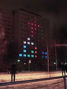 The object of Mikontalolights project was to create the world's physically largest colored graphics platform by using the windows of Mikontalo's D block as light pixels. The platform was used for playing Tetris and other games and present demos created by the students of Tampere University of Technology. The project climaxed on December 4 when the new lights of the building were lit. The goal was to gain global visibility for Tampere University of Technology and the rich student culture of city of Tampere.