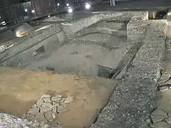 In 1960 excavation moved to an extramural settlement outside the rampart, which had been reached over the river course by a wooded bridge. Extensive remains of wood were recovered including a logboat. Also discovered was a circular stone rotunda church with two semi-circular apses.[14] Also in 1961 the 8th church was excavated, which had a rectangular nave and chancel. The graves of surrounding cemetery were relatively poorly furnished, but in the nave of the church was found a large hoard ironwork, including axes, ploughshares sickles and iron ingots.[15] Also excavated was the bridge leading into the Outer bailey and the surrounding rampart. Finds from river-bed included another longboat, an archery bow, identified as being made from English yew, wicker fish-traps, ladles, spoons, buckets and vats.[14]