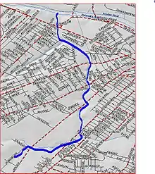Mile Run drains an area in the suburbs of New Brunswick. Its source is at 40°28′14″N 74°28′48″W,[1] near the intersection of How Lane (CR-680) and Jersey Avenue (SR-91). It crosses Jersey Avenue and flows through a residential development near Livingston Avenue (SR-26). It then crosses some railroad tracks and crosses Jersey Ave. It crosses French Street (SR-27) one mile from the Raritan River, giving it its name. It flows between residential areas and crosses Hamilton Street. It joins a tributary from the south and crosses Easton Ave and Landing Lane before draining into the Raritan River at 40°28′38″N 74°28′3″W.[1]