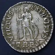 The miliarense (neuter form of the late Latin miliarensis, "pertaining to a thousand"; plural: miliarensia) was a large silver coin, introduced to the late Roman monetary system in the early 4th century. It was struck with variable fineness, generally with a weight between 3.8 and 6.0 grams, and a diameter of c. 23–24 mm. The miliarense was struck first under Constantine the Great (r. 306–337).[1]