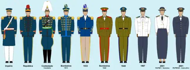 From 1854 until the early years of the Republic, the PMPR used the dark blue in their uniforms. In 1912[6] was adopted the khaki color, which by tradition is still in use today. The firefighters wear the same uniforms of the Military Police, just adding their badges and insignias.