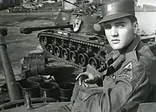 Presley spent four days at Fort Chaffee before being transferred to Fort Hood in Texas.[6] After being assigned to Company A of the Third Armored Division's 1st Medium Tank Battalion, Presley completed basic training by June. He had become a pistol sharpshooter, and expressed his enjoyment at the "rough and tumble" of the tanks obstacle course.[6] To friends back home, however, he was less upbeat. In letters to friend Alan Fortas, Presley described his homesickness and insisted that he hated the training.[6] Eddie Fadal, another of Presley's friends, remembers that Presley would worry about his career, fearing it was all over. One of Presley's instructors, Bill Norwood, who let Presley use his phone to call home on many occasions, recalls Presley breaking down in tears during many of these phone calls.[6]