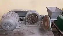 In materials processing a grinder is a machine for producing fine particle size reduction through attrition and compressive forces at the grain size level. See also crusher for mechanisms producing larger particles. In general, grinding processes require a relatively large amount of energy; for this reason, an experimental method to measure the energy used locally during milling with different machines was recently proposed.[3]
