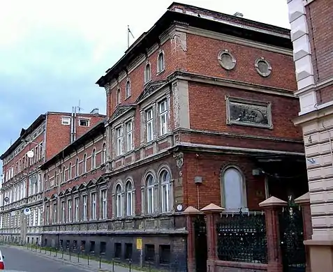 Grain turnover gave rise to new industries, creating needs for new mills and bakeries. In 1825 a consortium took control of mills on Mill Island, trading within local market but also abroad, Germany, Great Britain, and even Brazil.[18] In 1842, Rother's Mills were integrated in a complex of several facilities, renamed Royal Mills, pioneering the first steam engine in Bydgoszcz in 1846. This year is the one of the start of erection of actual Rother's Mills, on the area belonging to merchant Rauber were previously stood gardens.[19] The entire Rother facility has been complete in 1849-1850. The project comprised not only a massive production building, but also: