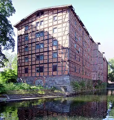 Located on the waterfront of the leat branch, it was built around 1835 following timber framing method, with brick fillings.[13] It was initially used to store bagged grains.[15] The building has an elongated rectangle footprint, with a storey and windows on the roof wystawki.[13] In the 1990s, the granary has undergone thorough renovations. Today it houses the restaurant The Mill Tavern, Polish: Karczma Młyńska.[16] The building has been listed on Kuyavian-Pomeranian Voivodeship Monuments Heritage List, (N°601214, reg.A/773/1-9, June 9, 1992).[14]