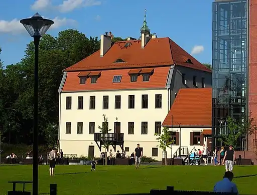 Located in the eastern part of Mill Island, on the banks of the Brda river, in the vicinity of the parish weir, it is the oldest preserved building in the Island. It was built in the 1790s in connection with the emergence of new grain mills in the northern part of the Mill Island. Till 1827, it was owned by the Kingdom of Prussia, then bought by Padecker, a merchant. Since then, its successors are companies. It was not until 1919 that it became the property of local governments, and then of the Polish state treasury.[12] The facility was used till 1974 as a grain warehouse. Since the 1980s, the building houses the history department of "Leon Wyczółkowski" District Museum: here is mainly exhibited Bydgoszcz's history and craft traditions in Kujawy. From 2006 to 2008, the building was extensively renovated under the program "Restoration of cultural heritage on Mill Island"[6] and fitted for exhibiting archaeological collections.