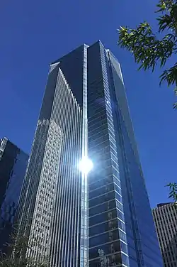 The residences are expensive; a penthouse unit sold for $13 million in December 2016.[19][20] The bottom 25 floors of the main tower are called Residences while the floors from 26 to the top have the name Grand Residences. (As is common in many high-rises, there is no thirteenth floor because of superstitions related to triskaidekaphobia. Neither is there a forty-fourth floor, because the number four is considered unlucky by many Asians.[21]) The 53 units in the separate 12-story tower are called the City Residences.[1] Below street level, there are 434 parking spaces in a five-level subterranean garage located under the 11-story tower.[15] The building is located next to the site of the Transbay Transit Center. Overall, the tower's design is intended to resemble a translucent crystal, and is a landmark for the Transbay Redevelopment and the southern skyline of San Francisco.[18]