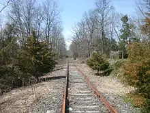 The Millstone Branch boasted 12 daily passenger trains East Millstone to New York City. Passenger stations, which consisted of small wooden shacks, were located at East Millstone, South Middlebush Road, Clyde Road, Voorhees (now Route 27), and Jersey Avenue. Passenger service permitted Millstone residents easy access to New Brunswick for shopping on weekends and allowed New York City businessmen the opportunity to commute. With the advent of the automobile, all passenger service ended in 1930.[3] After that year the track past Route 27 (Voorhees) was used sporadically by a local freight train to access the rubber factory in East Millstone; track became weed-covered and maintenance deferred. The stations at Clyde and Voorhees were abandoned on June 8, 1932.[4] The last passenger station to survive was Middlebush, which was razed in 1948.[2]