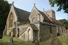 The Church of England parish church is dedicated to Saint Blaise as he is the patron saint of the wool trade, which was a major part of Milton's medieval economy. The church seems to have been built in the 14th century[2] but only the porch, the lower part of the bell tower and part of the nave including the west window survive from this time.[2] The upper part of the tower was rebuilt in the 18th century[2] and the nave, chancel and four-bay north aisle were rebuilt by the Gothic Revival architect Henry Woodyer in 1849–51.[6] Under the chancel arch is the Barrett family vault, in which the Roman Catholic bishop Richard Challoner (1691–1781) was buried[2] until 1946 when his remains were translated to Westminster Cathedral. The church is a Grade II* listed building.[9]