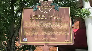 Caniff was born in Hillsboro, Ohio. He was an Eagle Scout[2] and a recipient of the Distinguished Eagle Scout Award from the Boy Scouts of America. Caniff did cartoons for local newspapers while studying at Stivers High School (now Stivers School for the Arts) in Dayton Ohio. At Ohio State University, Caniff joined the Sigma Chi fraternity and later illustrated for The Magazine of Sigma Chi and The Norman Shield (the fraternity's pledgeship/reference manual). Graduating in 1930, Caniff began at the Columbus Dispatch where he worked with the noted cartoonists Billy Ireland and Dudley Fisher, but Caniff's position was eliminated during the Great Depression. Caniff related later that he had been uncertain of whether to pursue acting or cartooning as a career and that Ireland said, "Stick to your inkpots, kid, actors don't eat regularly."[3]