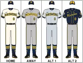 The set included a cream home uniform with "Brewers" and numbers in stylized block letters (a nod to Milwaukee's "Cream City" nickname), a home alternate pinstriped white uniform which shares the same features as the cream uniforms, a grey road uniform with "Milwaukee" and numbers in stylized block letters, and a road alternate navy uniform with "Milwaukee" in script letters and numbers in stylized block letters. The home sleeve patch features a navy baseball with stylized barley seams, while the road sleeve patch features the gold Wisconsin map with Cream City bricks and a baseball to represent Milwaukee's location. The road alternates are paired with a navy cap with gold front panels; all other uniforms are paired with the all-navy cap.[13]