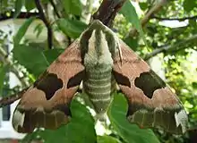 The larva is green with yellow and red markings along the side and a blue horn at the hind end, typical of the family. It feeds mainly on lime but has also been recorded feeding on other trees and shrubs (see list below). The colour changes to purple-grey when ready to pupate, at which point the larvae wander in search of a pupation site.[2] The species overwinters as a pupa in the soil at the base of its host tree.