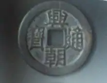 "Xing Chao Tong Bao" (興|朝通寶) was produced by Sun Kewang, in 1649 (sixth year of Shunzhi), when he became the Dongping King.[35] At that time, Sun produced a large number of "Xing Chao Tong Bao" and it had its distinct features with a profound influence.[35] The style of the Chinese characters on the coinage was plain.[35] Most of the coinage was made of copper.[35] Though the work was a little rough, but it was given full weight.[35] This style was reflected in the later "Li Yong Bao Tong", "Zhao Wu Tong Bao" (昭|武通寶) produced by Wu San-Gui and "Hong Hua Tong Bao" produced by Wu shifan.[35]