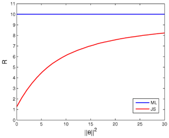 The risk is constant, but the ML estimator is actually not a Bayes estimator, so the Corollary of Theorem 1 does not apply. However, the ML estimator is the limit of the Bayes estimators with respect to the prior sequence , and, hence, indeed minimax according to Theorem 2. Nonetheless, minimaxity does not always imply admissibility. In fact in this example, the ML estimator is known to be inadmissible (not admissible) whenever . The famous James–Stein estimator dominates the ML whenever . Though both estimators have the same risk when , and they are both minimax, the James–Stein estimator has smaller risk for any finite . This fact is illustrated in the following figure.