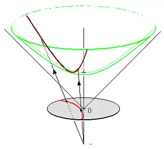 Let and let If then it is geometrically clear that the vector intersects the hyperplane once in point denoted One has or By construction of stereographic projection one has This leads to the system of equations The first of these is solved for and one obtains for stereographic projection Next, the inverse must be calculated. Use the same considerations as before, but now with One gets but now with depending on The condition for P lying in the hyperboloid is or leading to With this , one obtains |