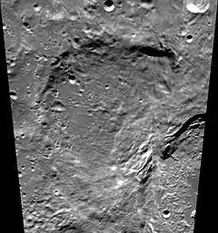 Nearly half the crater is overlain by the rim, outer rampart, and ejecta from Antoniadi. The remaining rim is worn and eroded, with a number of small craterlets along the edge and inner wall. The western interior floor is relatively level, but is marked by ejecta and secondary cratering from Antoniadi. If the crater ever possessed a central ridge, it may now be buried.