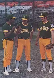 The Minnesota Goofy's, named after a local bar, played in the APSPL in 1977, finishing with a record of 24-30 (.445) and out of the inaugural playoffs.[9][10][11] Initial owner Joe Houle ran into financial challenges running the team and sold to Steve Doran mid-season. The Goofys had lost 16 games in a row, Doran fired Manager Dennis Willey and brought in Terry Fredericks to lead the team to finish the season.[12] Minnesota Joe Russell (35 HRs, 111 RBIs) and Gene Parrish (batted .622 with 115 runs scored) made the 1977 all-league team for Minnesota. Bob Boyson (.578 BA), Dale Palm (42 HRs) and Mike Perfetti (437, 33 HRs, 68 RBIs) had solid seasons in support for the Goofy's. Benny Holt of the Chicago Storm (softball) won the triple crown and league MVP, with the Detroit Caesars winning the first professional softball World Series trophy. Minnesota in 1977 briefly featured former Minnesota Twin and 1965 American League MVP Zoilo Versalles, who played until early July before hanging up his softball spikes.[13][14][15][16] [17] The Goofy's were sold mid-season and renamed the Norseman for 1978.[18][2][19][20]