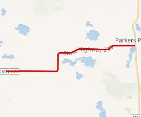 Minnesota State Highway 235 (MN 235) was a 10.027-mile-long (16.137 km) highway in west-central Minnesota, which ran from its intersection with Otter Tail County Road 59 in Urbank and continued east to its eastern terminus at its intersection with State Highway 29 in Parkers Prairie. In 2013, the route was removed from the state highway system.[3] The route became an extension of Otter Tail County Road 38.