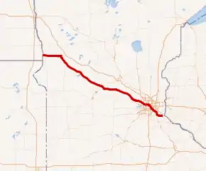 This route, signed east–west, runs roughly diagonally across the central part of Minnesota.